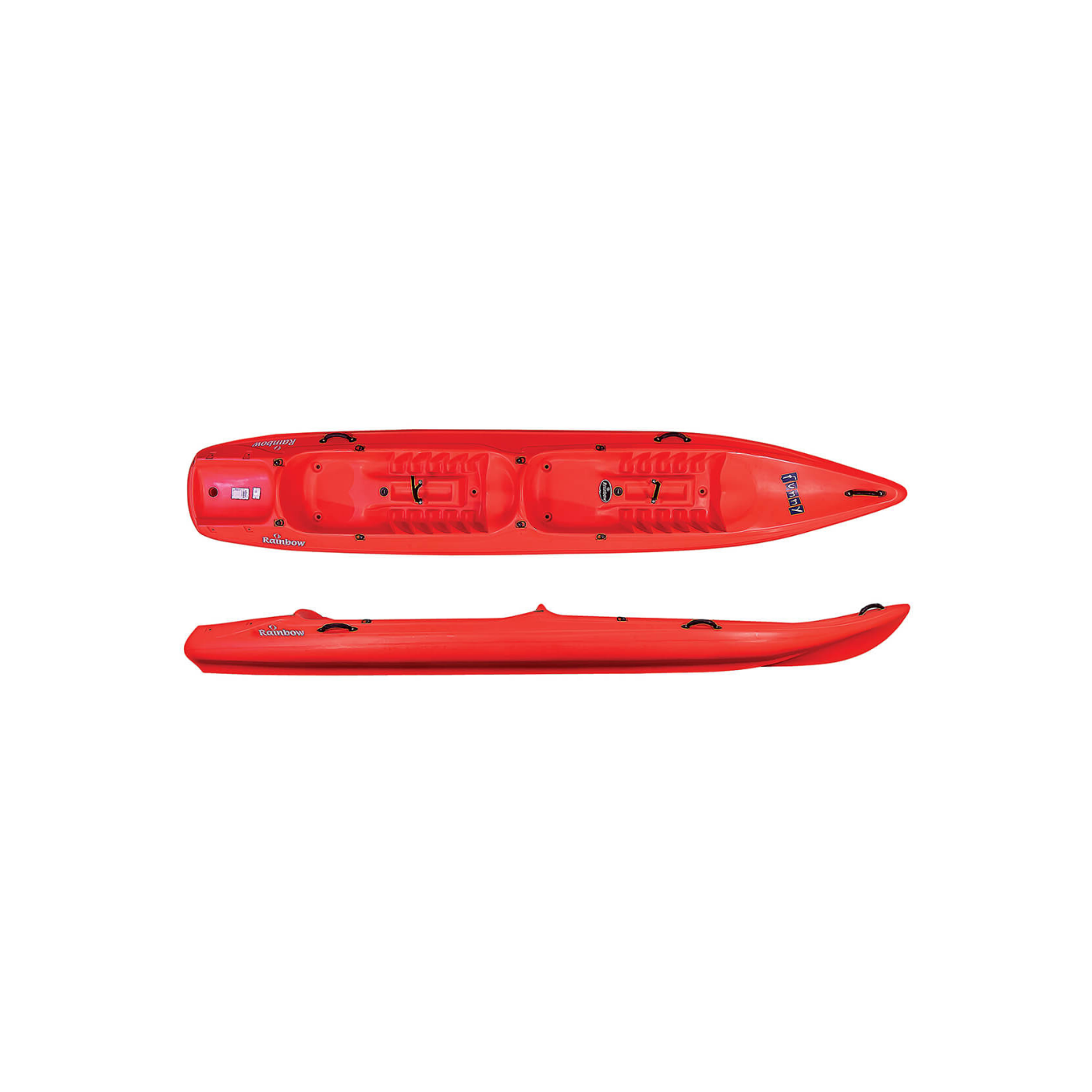 NEW FUNNY TWIN Selfbailing and unsinkable Sit-On-Top, easy to use and twice as fun. Ideal for families, rental, resorts and tour operators. It comes standard with third seat for children, drain plug, 3 carrying handles, storage net and with a recess for watertight container or bag.